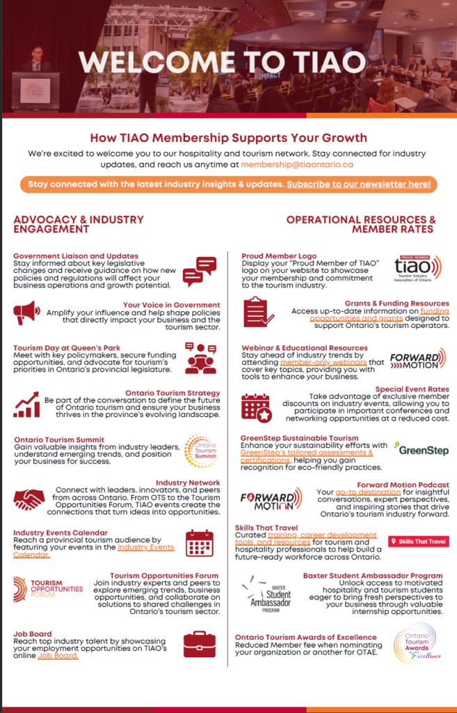 Interested in joining Ontario’s leading tourism advocacy organization? Continue to the next page to join Ontario’s leading tourism advocacy organization. TIAO bridges the gap between industry and government, championing the economic importance of tourism across the province.